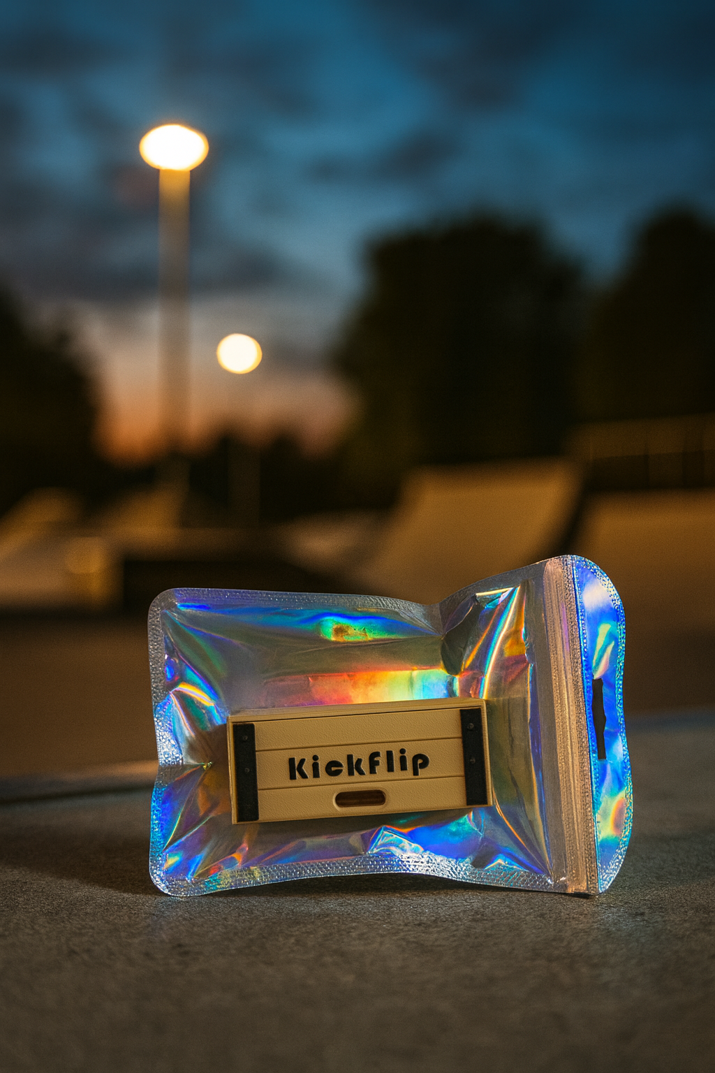 Holograficzne wykończenie nadaje mu wyjątkowy klimat i sprawia, że wyróżnia się na tle zwykłych, nudnych opakowań. To nie tylko ochrona produktu, ale też element stylu, który idealnie wpisuje się w świat fingerboardingu i miejskiej zajawki.